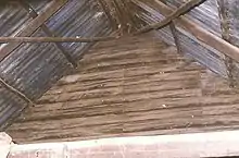 The Stables, originally a weatherboard structure has been partially reclad with galvanised iron sheeting. It is timber framed with an impressive central aisle of timber posts. The aisle is flagged with stone and lined with half height doors, swung on forged strap hinges. The stalls are separated by vertical slab partitions. The ceiling and corresponding floor of the hayloft, is bark, supported on poles.[1]