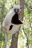 Its dorsal pelage and tail are white, with maroon patches on the chest and portions of the limbs. The coat is generally dense. Its face is bare and black except for a distinctive patch of white fur along the bridge of the nose. Its naked ears are also black, and its eyes are yellow or orange.[4][5] The bottom of the lemur's hands and feet are black, while the thighs, arms, and chest are a chocolate brown. Like all lemurs, Coquerel's sifaka has a toothcomb, used for grooming and sometimes scraping fruit off a pit.[6]