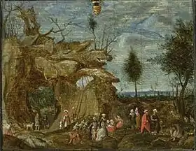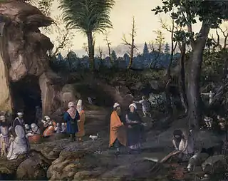 The early 17th century artist biographer Karel van Mander called van Dalem an excellent painter of rocks ('fraye schilder van rotsen').[9] And indeed several of his landscape paintings feature extensive rock parties with grottos. Examples are the Landscape with Adam and Eve of 1564 (Iris & B. Gerald Cantor Center for Visual Arts) and the Landscape with herders of c. 1560 (Prado Museum). Van Dalem's rock landscapes often include a grotto where some human activity is going on. These works had an influence on Joos de Momper who was an important adept of the genre and created about 70 paintings of this motif.[10]