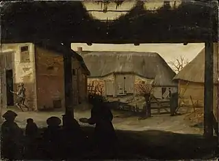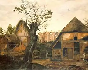 The paintings dealing with the subject of the development of civilization find their counterpart in the composition Landscape with Farmhouse (1564, Alte Pinakothek). Here van Dalem seems to address the topic of the decay of culture, which is represented in the form of a ruined church, dilapidated hut and barren trees and earth.