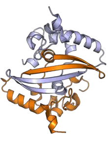 X-ray crystallography structure of the dimer formed by two C-terminal domains from the SARS-CoV-2 N protein.[7]
