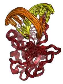 NMR structure of the SARS-CoV-2 N protein N-terminal domain (red) in complex with double-stranded RNA (orange and yellow).[10]