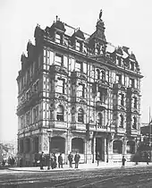 ![]() Southward view along Corporation Street – the two terracotta buildings are Victoria Law Courts to the left and the Methodist Central Hall to the right | |
