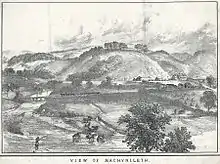 Lithograph showing a horse-drawn train on the Corris Railway crossing the Dovey Bridge, probably drawn in the late 1860s