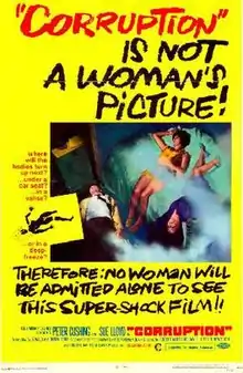Corruption is a 1968 British horror film directed by Robert Hartford-Davis and starring Peter Cushing, Sue Lloyd, Noel Trevarthen, Kate O'Mara, David Lodge, and Antony Booth.[1] The screenplay is by Derek Ford and Donald Ford,