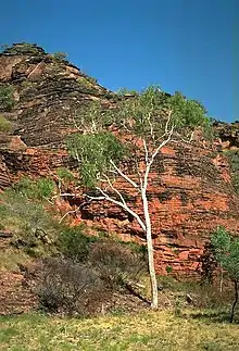 Corymbia dichromophloia grows in woodland on hills, ridges, plains and near river banks on red or yellow sandy soils over granite or sandstone. It is found in Western Australia, including in the Kimberley region and Wunaamin Miliwundi Ranges, in the Top End and south to Katherine in the Northern Territory, and near Mount Isa, Cloncurry and Normanton in Queensland.[2][3][6]