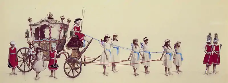 The 70th birthday of Christian IX was celebrated with a ball attended by 700 guests at Amalienborg Palace. The entertainment after dinner comprised a cotillion in the Great Hall of Christian VII's mansion. As a surprise, it opened with a procession consisting of the specially manufactured miniature coach escorted by children dressed as elves, runners and lackeys. Inside the coach was a girl dressed as an "ambassadress from a distant country". Lord chamberlain Carl Løvenskiold, who had been responsible for the planning of the ball, had also fostered the idea of the tableau and arranged for the construction of the carriage. The next day, Fredericia Dagblad provided a detailed account of the event:[1]