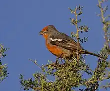 The cotingas are a large family, Cotingidae, of suboscine passerine birds found in Central America and tropical South America. Cotingas are birds of forests or forest edges, that are primary frugivorous. They all have broad bills with hooked tips, rounded wings, and strong legs. They range in size from 12–13 cm (4.7–5.1 in) of the fiery-throated fruiteater (Pipreola chlorolepidota) up to 48–51 cm (19–20 in) of the Amazonian umbrellabird (Cephalopterus ornatus).[1][2]