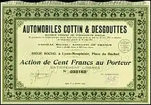 Share of the Automobiles Cottin & Desgouttes, issued 10. January 1922