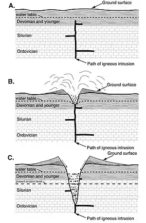 All of "Devonian and younger", "Silurian", and "Ordovician" are country rock. The igneous intrusion leads to a volcanic eruption.