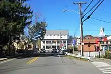 Past the reservoir, CR 513 splits from Route 31 and continues east on two-lane undivided West Main Street, entering residential areas. The road curves northeast and heads into High Bridge, where it turns north again. The route turns east onto Bridge Street and passes under New Jersey Transit’s Raritan Valley Line at the High Bridge station. After this, CR 513 makes a turn to the north onto Main Street and passes through the commercial downtown area. The route briefly heads east on Church Street before turning north onto Fairview Avenue and entering residential areas. The road heads into Lebanon Township and enters more mountainous and forested areas as it passes near Voorhees State Park. The route passes a mix of woods and homes as it intersects CR 628 and turns northeast, continuing through areas of farms, trees, and homes in a narrow valley. The roadway forms the border between Lebanon Township to the northwest and Califon to the southeast as it passes businesses and intersects the western terminus of CR 512. Past the CR 512 intersection, CR 513 fully enters Califon and continues past homes and commercial establishments. Upon entering Lebanon Township again, the road continues north through farmland and woodland with a few developments.[1][2]
