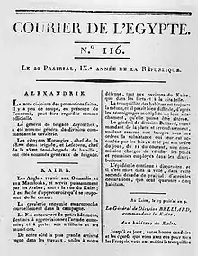 The Courier de l'Égypte[lower-alpha 1] (the Courier of Egypt) was a newspaper used for propaganda purposes during the Napoleonic invasion of Egypt, focusing on war and the "travel stories of many correspondents wandering around Cairo on the lookout for a picturesque scene".[1]