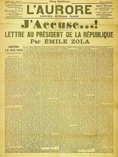 Front page of the newspaper L’Aurore of Thursday 13 January 1898, with the famous open letter J'Accuse…! written by Émile Zola to the President of France about the Dreyfus Affair. The headline reads "I accuse! Letter to the President of the Republic". See J'accuse...!, the whole text on Wikisource