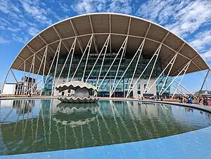 The Bangladesh Government planned to extend the rail track from Dohazari of Chittagong to Gundum of Bandarban. The trans-Asian railway network was to be connected to the proposed Ghumdhum railway station. The government also planned to build another railway track from the proposed Ramu railway station to Cox's Bazar to make another railway station in Cox's Bazar, in order to boost tourism in the city.[3] The new railway line extended to Ghumdhum[4] and proposed railway station in Cox's Bazar is being built simultaneously. Construction started in August 2017.[5] The architect of the station, Mohammad Foyez Ullah, took inspiration from the shape of an oyster for its exterior,[6] which symbolizes the beach.[7] The foundation stone of the station building was laid on 14 January 2021.[8] Its construction cost is Tk 214 crore. In January 2022, the construction of the railway station was 45% complete.[9] Another 40% of the construction work was completed in March 2023.[6]