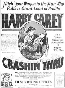 Crashin' Thru is a 1923 American silent Western film directed by Val Paul and starring Harry Carey.[1] With no copies of Crashin' Thru located in any film archives,[2] it is a lost film.