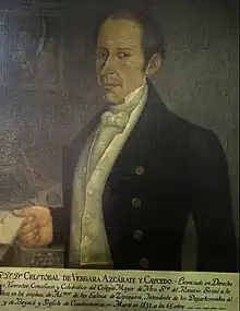 Cristóbal de Vergara Azcárate y Caycedo (1766-1831) was a Colombian lawyer, professor, accountant and politician who graduated from Del Rosario University in Bogotá. Vergara served as Minister of Finance, governor of Cundinamarca, Cauca (1825) and Boyacá, designated by President Francisco de Paula Santander. He also was the administrator of the sea salt mines of Zipaquirá during the presidency of Simón Bolívar.[1][2][3] Between 1795 and 1804, Vergara worked as the Accountant of the Royal Accounts and administered the prominent monopoly of Aguardiente.[4]