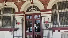 The external walls are unpainted brickwork, with painted plaster ornamentation to the western facade. The openings to the lower level of this facade are decorated with moulded plaster archways with keystones, cornices and projecting window sills and are separated by fluted pilasters. There is a series of entrances which, beginning from the north, lead to a tenancy, a blocked shopfront possibly also a former tenancy, the Public Bar, the Stair Hall leading to the accommodation wings, and the Lounge Bar which leads into the Bistro area. The recessed entry vestibule leading to the Stair Hall features tessellated floor tiles. The main bedrooms open onto this verandah. The painted pilasters continue through the first level separating the doorways to the Bedrooms of this wing. Above the verandah roof is a rendered entablature and balustraded parapet with pedestals topped also with a clover leaf motif.[1]