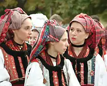 Women tend to wear skirts down to their ankles and a white blouse. Their attire is generally in earth-tones, with white, brown, and black being most common, however, blue dresses and aprons are reserved for married women, while white is for the unmarried ones. Unlike the Croats from the north, the special sandals (opanci) are worn daily. However, liberties are taken with the apron, which is often woven with colorful stitching and patterns with geometric motifs. Multi-colored wool socks (priglavci or nazuvci) with various geometric design are worn over the opanci.[2] For headwear, women wear embroidered kerchiefs or white kerchiefs pinned to their hats. Jewelry such as earrings, bracelets, and necklaces are silver, and necklaces (djerdan) and earrings are often made of silver coins, traditionally from the 19th century Austrian coins (talira).[2]