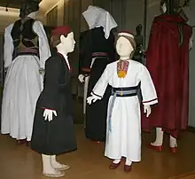 Perhaps the most famous example of Zagora costume comes from the small town of Vrlika, rich in dance and tradition still carried on today. Both men and women's dress wear is characterized by multiple subjects of clothing over another.[5] For men, the costume consists of carefully chosen pieces worn over each other: a red sash is tied around dark pants with a fringe of threads hanging from the belt in red, blue, or green colors. Due to centuries of military mentality, a special leather belt is worn to carry weapons.[5] Over the shirt is a decorated tunic, elaborate in design and custom-made fringe. The vest that is worn is vastly decorated with gold and red embroidery and patterns and designs, with different styles or material and cut depending on the seasonal weather. Much like the men, the women's dress consists of clothing worn over more clothing: a white blouse, skirt or tunic is most common, with a colorful apron consisting of complicated geometric patterns and fringe worn over, as well as a red vest with gold stitching made in a way to make it stand out from the white blouse.[5] Jewellery consists mainly of beads worn around the neck and silver coins adorned around the costume. Both men and women wear red felt pillbox caps (bareta or crvenkapa), with a white habit attached to the women's.