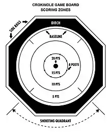 Board dimensions vary with a playing surface typically of polished wood or laminate approximately 26 inches (660 mm) in diameter. The arrangement is 3 concentric rings worth 5, 10, and 15 points as you move in from the outside. There is a shallow 20-point hole at the centre.[1] The inner 15-point ring is guarded with 8 small bumpers or posts. The outer ring of the board is divided into four quadrants. The outer edge of the board is raised slightly to keep errant shots from flying out, with a gutter between the playing surface and the edge to collect discarded pieces. Crokinole boards are typically octagonal or round in shape. The wooden discs are roughly checker-sized, slightly smaller in diameter than the board's central hole, and typically have one side slightly concave and one side slightly convex, mainly due to the inherent features of wood, more than a planned design. Alternatively, the game may be played with ring-shaped pieces with a central hole.