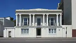 The central seafront of St Leonards-on-Sea is dominated by tall Regency-style terraces built between the early 1830s and the mid-1850s, all designed by James Burton. Crown House forms an "atypical break in the overall composition" through its shorter height and "architectural expressiveness".[23] "Much smaller and more elegant" than the adjacent terraces and the "crass" postwar block immediately to its west,[24] it is a Classical-style building of two storeys with a symmetrical three-bay façade.[24] The walls are of painted stucco;[17] the ground floor has a series of recessed painted panels flanking the windows,[24] which are also set in recessed panels with segmental-headed arches. The central entrance door is also set back. At first-floor level, fluted Ionic columns rise to support an entablature and cornice whose parapet has a shallow pediment in the middle. There are three windows: a tall sash in the centre, flanked by pilasters, and pilastered bay windows to each side. A "delicate wrought iron railing" runs across the width of the first floor.[17]