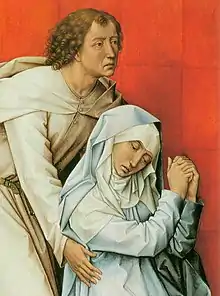 Art historian Penny Howell Jolly was the first to propose that the diptych was painted for an unnamed Carthusian monastery.[7] Carthusians lived a severely ascetic existence: absolute silence, isolation in one's cell except for daily Mass and Vespers, a communal meal only on Sundays and festival days, bread and water on Mondays, Wednesdays and Fridays, clothes and bedding of the coarsest materials.[8] Van der Weyden's son Cornelis entered the Carthusian Monastery of Herrines about 1449, and was invested in the order in 1450.[9] The artist donated money and paintings to the order during his lifetime, and made a bequest to it in his will.[10] His only daughter Margaretha became a Dominican nun.[11] Art historian Dirk de Vos describes the diptych as a "monastically inspired devotional painting" whose composition was "largely determined by the scetic worship of the Carthusians and Dominicans."[12]