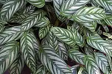 Ctenanthe oppenheimiana, the giant bamburanta or never-never plant, is a species of flowering plant of family Marantaceae and is a native of Brazil.[1] It is an evergreen perennial. This plant can grow to more than 1 m (3.3 ft) tall and broad, with long narrow leaves up to 40 cm (16 in) in length. The leaves are adorned on the secondary veins with dark green bands, which meet and merge in the margins. In between are cream coloured bands. The undersides of the leaves have a red-ish colour.[2][3][4] The cultivar ‘Tricolor’ is a common ornamental variety, which as a houseplant in the UK has gained the Royal Horticultural Society’s Award of Garden Merit.[5] (confirmed 2017).[6] This cultivar is visually very similar to Stromanthe Sanguinea 'Triostar', and the two are often confused. The difference between the two lies in the lack of regular banding on the leaves of the Sromanthe, and the generally more rounded shape of the leaves in Ctenanthe.[7]
