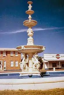 By 1920 the Paroo Shire Council had decided to erect a war memorial fountain in the centre of Cunnamulla town. However, it appears that the memorial was not erected immediately as in July 1924, the masonry firm of Andrew Lang Petrie, Brisbane wrote to the Paroo Shire Council offering designs. In September 1926, the Paroo Shire Council and the Diggers' Racing Club agreed to erect a fountain, expecting it to be in place in time for the Diggers' Carnival on 11–13 November that year.[4] The design is a copy of a fountain in Rome erected some 400 years earlier and believed to be the work of the sculptor Carozzo; the Cunnamulla fountain was executed by R.C. Ziegler and Son.[5]