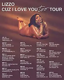 The Cuz I Love You Too Tour was the second headlining concert tour by American singer and rapper Lizzo in support of her third studio album, Cuz I Love You. The tour began on July 18, 2019, in Troutdale, Oregon, and concluded on January 15, 2020, in Auckland, New Zealand.[1]
