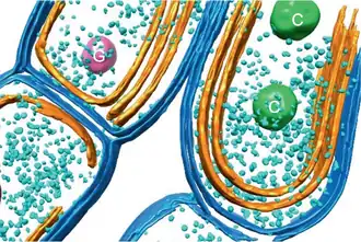 Cyanobacteria use the energy of sunlight to drive photosynthesis, a process where the energy of light is used to synthesize organic compounds from carbon dioxide. Because they are aquatic organisms, they typically employ several strategies which are collectively known as a "CO2 concentrating mechanism" to aid in the acquisition of inorganic carbon (CO2 or bicarbonate). Among the more specific strategies is the widespread prevalence of the bacterial microcompartments known as carboxysomes,[63] which co-operate with active transporters of CO2 and bicarbonate, in order to accumulate bicarbonate into the cytoplasm of the cell.[64] Carboxysomes are icosahedral structures composed of hexameric shell proteins that assemble into cage-like structures that can be several hundreds of nanometres in diameter. It is believed that these structures tether the CO2-fixing enzyme, RuBisCO, to the interior of the shell, as well as the enzyme carbonic anhydrase, using metabolic channeling to enhance the local CO2 concentrations and thus increase the efficiency of the RuBisCO enzyme.[65]