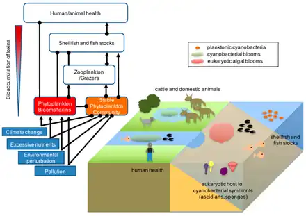 Cyanobacteria are globally widespread photosynthetic prokaryotes and are major contributors to global biogeochemical cycles.[25] They are the only oxygenic photosynthetic prokaryotes, and prosper in diverse and extreme habitats.[26] They are among the oldest organisms on Earth with fossil records dating back at least 2.1 billion years.[27] Since then, cyanobacteria have been essential players in the Earth's ecosystems. Planktonic cyanobacteria are a fundamental component of marine food webs and are major contributors to global carbon and nitrogen fluxes.[28][29] Some cyanobacteria form harmful algal blooms causing the disruption of aquatic ecosystem services and intoxication of wildlife and humans by the production of powerful toxins (cyanotoxins) such as microcystins, saxitoxin, and cylindrospermopsin.[30][31] Nowadays, cyanobacterial blooms pose a serious threat to aquatic environments and public health, and are increasing in frequency and magnitude globally.[32][25]