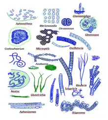Cyanobacteria are a very large and diverse phylum of photoautotrophic prokaryotes.[19] They are defined by their unique combination of pigments and their ability to perform oxygenic photosynthesis. They often live in colonial aggregates that can take on a multitude of forms.[20] Of particular interest are the filamentous species, which often dominate the upper layers of microbial mats found in extreme environments such as hot springs, hypersaline water, deserts and the polar regions,[21] but are also widely distributed in more mundane environments as well.[22]