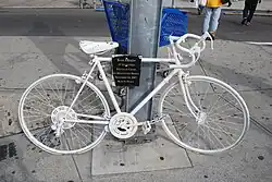 When mayor Bill de Blasio entered office in 2014, he sought to bring all traffic fatalities to zero through his Vision Zero initiative.[82] In 2017, 24 cyclists were killed, and 4,485 were injured in crashes in New York City.[83] Private parties have made maps of fatal crashes, and some fatality locations are marked by white-painted ghost bikes.[84] Although crash-related injuries to cyclists are not uncommon, their incidence has decreased even as the number of cyclists in New York City has increased. Between 2011 and 2015 there were 12.8 cyclist fatalities per 100 million cycling trips, compared with 44.2 cyclist fatalities per 100 million cycling trips between 1996 and 2000.[85]