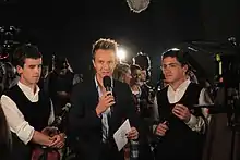 From 2013, he has played host at most of France 3's live performance programs in prime time: International Circus Festival of Monte-Carlo every year since 2013,[24] Le Grand Spectacle du Festival Interceltique de Lorient every summer since 2015,[25] Musiques en Fête live from the Chorégies d'Orange every year since 2017,[26] La Folie Offenbach in January 2018,[27] La Grande Parade des Nations Celtes since 2018.[28]