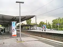 Benrath possesses a regional railway station on the railway track Cologne–Duisburg line of the historic Cologne-Minden Railway Company. The Düsseldorf-Benrath station is a pre-modern clinker brick building Bahnhof from the 1930s and the second railway station at this place. It is served by two Regional-Express services: RE 1 (NRW-Express) and RE 5 (Rhein-Express) and Rhine-Ruhr S-Bahn line S 6, all operated by Deutsche Bahn.