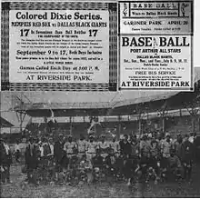 In 1908, the Black Giants lost the state championship losing deciding game five to the San Antonio Black Bronchos.[5] The 1922 team advanced to the Colored Dixie Series heralded on billboards around the city as "a little World Series." The Memphis Red Sox took the series six games to three.[6] The largest turnout for a game was between the Kansas City Monarchs and the Black Giants on April 21, 1935, when the Monarchs swept a double-header from Dallas.