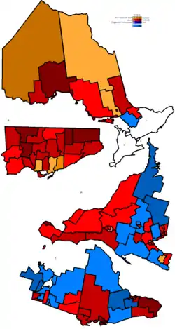 McGuinty was able to maintain his party's standing in the polls in the last stages, preventing Eves from making up ground during the leader's debate. On election day, the Liberal were elected to a majority government, winning 72 of the Ontario Legislature's 103 seats. The PC Party fell to 24 seats, while the NDP lost official party status in the legislature.[21]