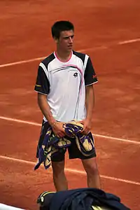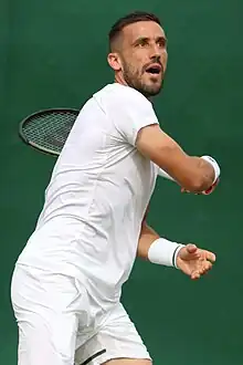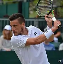 Damir Džumhur (Bosnian pronunciation: [dǎːmir dʒûmxur] JOOM-hoor;[2] born 20 May 1992) is a professional tennis player from Bosnia and Herzegovina. He is currently Bosnia and Herzegovina's No. 1 player.[3] His career-best singles ranking of World No. 23 achieved on 2 July 2018, makes him the highest-ranked player ever competing for Bosnia and Herzegovina.[4]