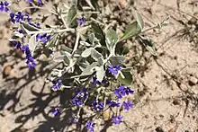 Dampiera altissima, commonly known as tall dampiera,[2] is an erect perennial herb of the family Goodeniaceae and is native to Western Australia. It is a perennial herb that generally grows to a height of up to 0.5 m (1 ft 8 in) and has flat, green-grey leaves. The leaves are mostly round and are between 8-60 mm (0.3 to 2.4 in) long. Dampiera altissima flowers during the winter and spring, unveiling small blue-purple flowers. The herb is a ground cover plant found growing on the sandplains, laterite and sandstone of the southwestern region of Western Australia, most common in the Geraldton area north of Perth. The species is sometimes grown as an ornamental plant and is listed as “not threatened”.