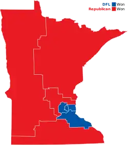 Due to changing political alignments, the Republican Party flipped the 7th district, which was held by 15-term incumbent Democrat Collin Peterson. This marked the first time since the 1944 election that Republicans won every district in Minnesota outside the Twin Cities metropolitan area, after Democrats had done the same just four years prior. This subsequently erased the slim Democratic majority in the state congressional delegation and gave both political parties a tied 4–4 delegation.[1]