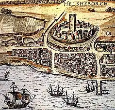 Artwork depicting the Scanian city of Helsingborg in 1588. Though anachronous, it shows the relevance of the city as a port