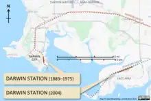 From 1889 to 1973, the North Australia Railway ran through Darwin and terminated at its own Darwin station. This station was at a different site to the modern one, near what is now Fishermans Wharf[2] (and like the city, it was known as "Palmerston" until 1911).
