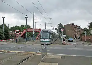 David Lane is a tram station on Nottingham Express Transit, in the city of Nottingham suburb of Basford. The tram lines here run parallel to the Robin Hood railway line that links Nottingham with Worksop, but there is no corresponding railway station. Both tram and railway lines have two tracks, and the resulting four tracks cross David Lane on a pair of parallel level crossings. The tram stop comprises a pair of side platforms on both sides of the tramway.[1][2]