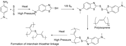 In the early years of rubber production, high quality natural rubber was obtained from the tree, Hevea braziliensis, found in the regions bordering the Amazon river.[5] The high quality rubber exhibited desired properties, such as a high tensile strength (greater than 2800 psi) and a two-hour vulcanization time. Vulcanization is the process by which natural rubber is strengthened by cross-linking the different polymer chains, with either elemental sulfur bridges or other molecules known as accelerators. However, high quality natural rubber was expensive, with a price exceeding $1.50 per pound.[5] Diamond Rubber experimented with various additives, such as mercury iodide and aniline, in an attempt to improve the properties of lower quality rubber. The addition of only 2.5 to 6 percent of these additives improved the tensile strength of low quality rubber from 1800 psi to 2800 psi, and shortened the vulcanization time to a 90 minutes. However, these additives were detrimental to the lifetime of the rubber. In 1912, Spence was working with George Oenslager at Diamond Rubber to discover different additives to overcome these shortcomings. Working off of Oenslager's aniline additives, Spence discovered that p-aminodimethylaniline was a far superior accelerator, requiring only 0.5 weight percent added to the vulcanization process, to vastly improve the tensile strength of the rubber.[5] P-aminodimethylaniline was adopted as the accelerator of choice by the Diamond Rubber Company in 1912.[6]