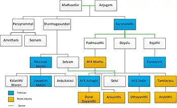 Dayanidhi is the second son of ex-minister Murasoli Maran, who had been the Commerce and Industrial minister. He is also the grandnephew of DMK president and ex-chief minister of Tamil Nadu M Karunanidhi. He is the younger brother of Kalanidhi Maran, the founder and managing director of Sun Network. He had his schooling with Don Bosco, Egmore,[1][2] Chennai. He received initial education in Tamil Nadu and graduated in Economics from Loyola College[3] in Chennai. He also attended the "Owner /President Management Programme" (OPM) from Harvard Business School (USA).[4] The Owner/President Management Programme is meant for business owners/founders.[5] Dayanidhi is married to Priya of "The Hindu" family. Priya is the daughter of Ramesh Rangarajan, Director Kasturi & Sons[6] and the pair have a daughter named Divya and a son named Karan.