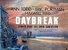 Daybreak is a 1948 drama by Riverside Studios – classified by some as 'British Noir' – directed by Compton Bennett and starring Eric Portman, Ann Todd and Maxwell Reed. It is based on a play by Monckton Hoffe.[2]