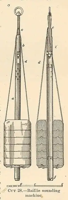 The first instrument used for deep-sea investigation was the sounding weight, used by British explorer Sir James Clark Ross.[4] With this instrument, he reached a depth of 3,700 m (12,139 ft) in 1840.[5] The Challenger expedition used similar instruments called Baillie sounding machines to extract samples from the sea bed.