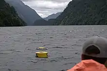 Science buoy deployed in Deep Cove, New Zealand in 2016 to detect stratification and mixing. The buoy was developed at the Scripps Institute of Oceanography.[8]