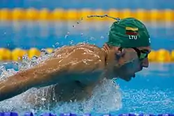 Deividas Margevičius (born 26 April 1995) is a Lithuanian butterfly swimmer. In 2016 he won the national 100 m, setting a new national record at 53.53.[2] With the best national season time (53.12) he was selected to represent Lithuania in 2016 Summer Olympics in the 4 × 100 m medley relay.[3]