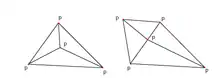 • Edges of the Voronoi diagram going to infinity are not defined by this relation in case of a finite set P. If the Delaunay triangulation is calculated using the Bowyer–Watson algorithm then the circumcenters of triangles having a common vertex with the "super" triangle should be ignored. Edges going to infinity start from a circumcenter and they are perpendicular to the common edge between the kept and ignored triangle.